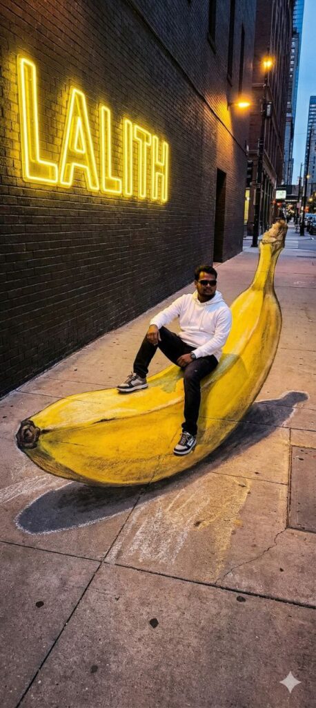 Prompt: Create a 3D illusion of a realistic giant yellow banana. A 25-year-old boy is sitting casually on top of the banana. He is wearing a white hoodie, black jeans, and sneakers. He looks cool and is wearing sunglasses. In the background, there is a neon light text on a dark wall that says “LALIT” in big yellow glowing letters. The overall lighting is cinematic and high quality.